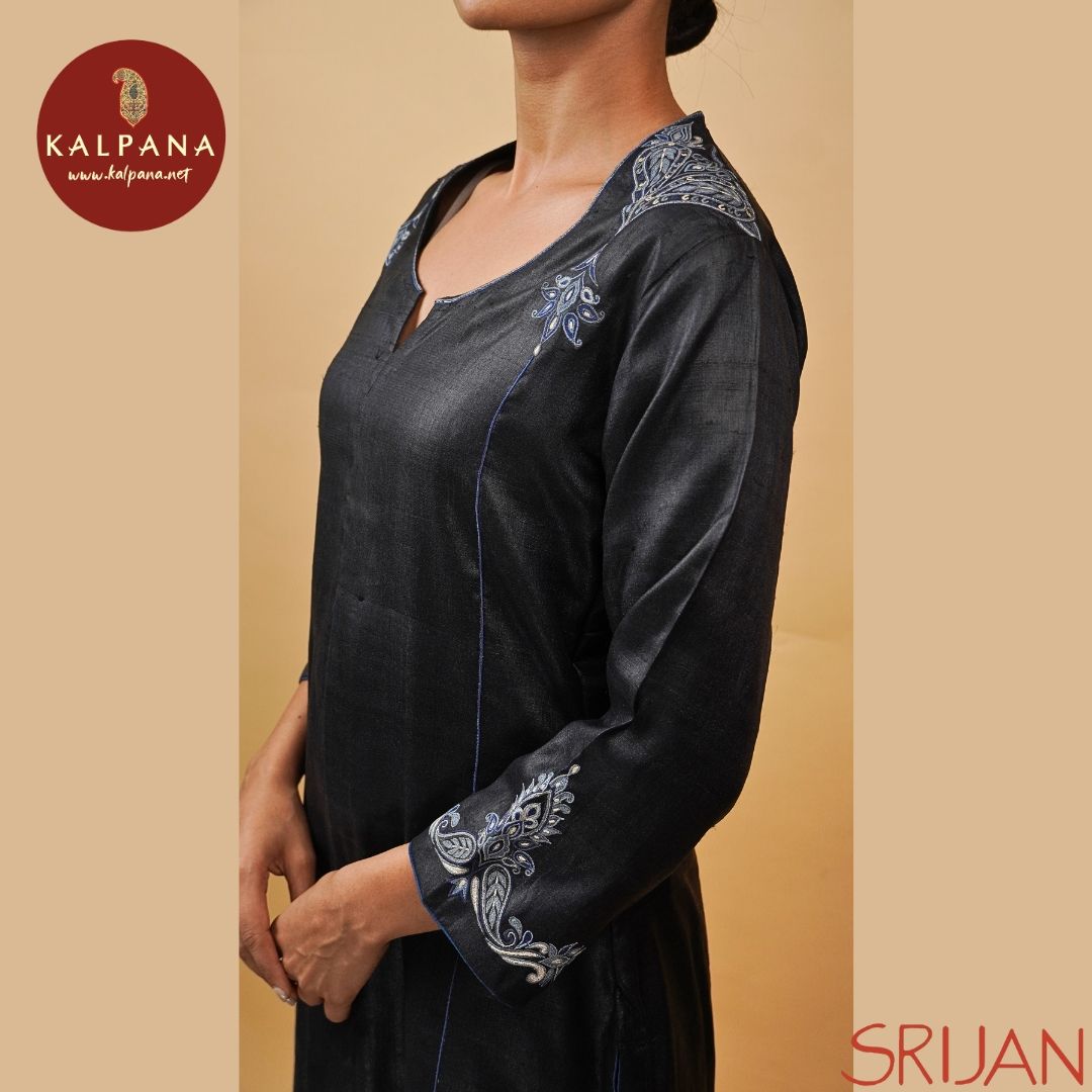 Top : Jaamevar A-Line Front Open Black Tussar Shirt and U neck with opening Neckline.