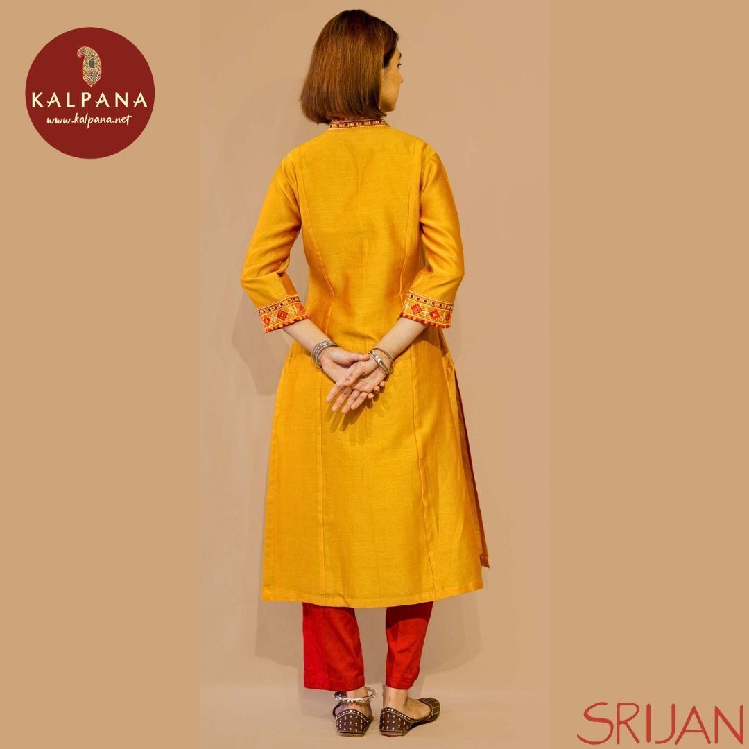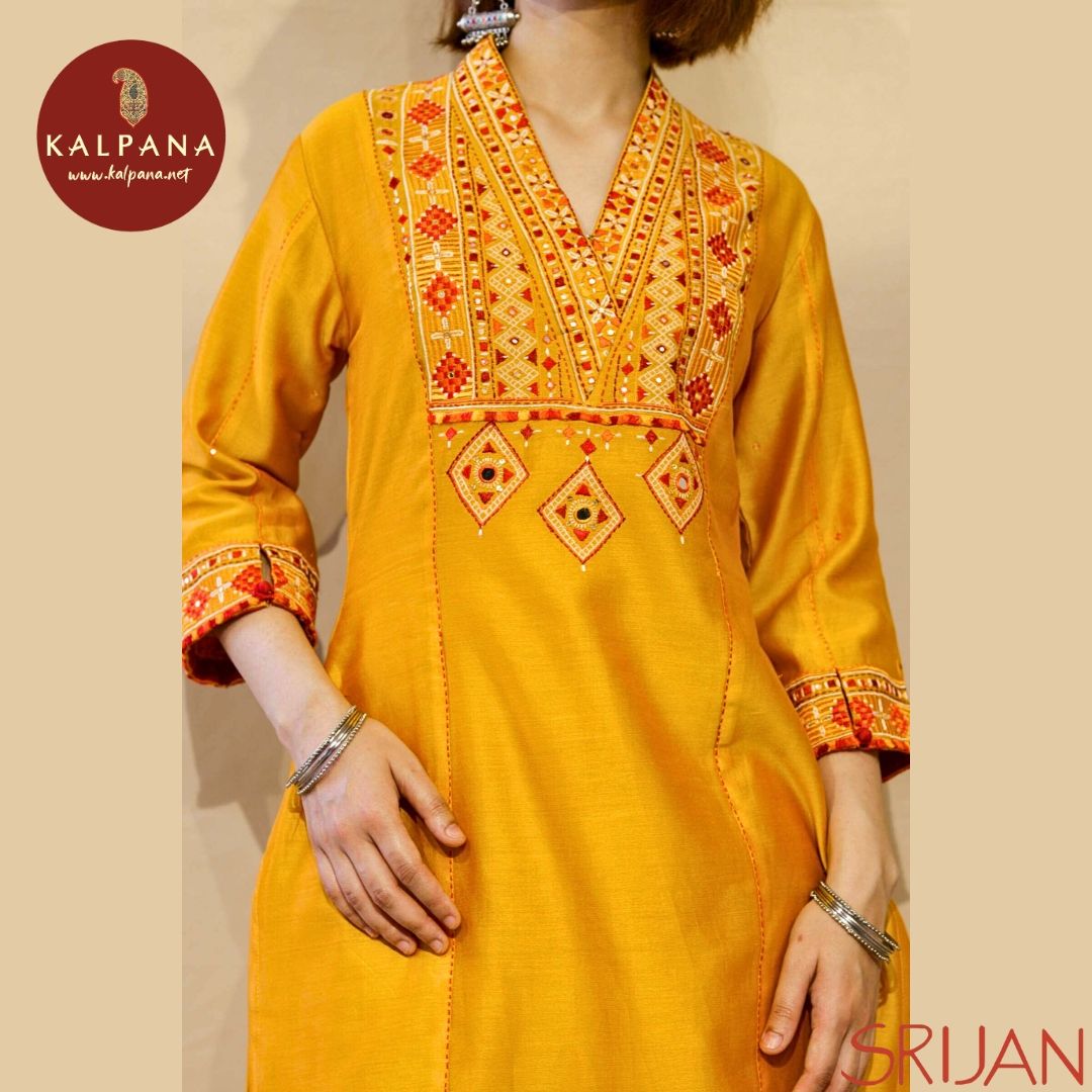 Top : Rabari Princess Line Yellow Chanderi Shirt and Overlap Neck with embroidery Neckline.