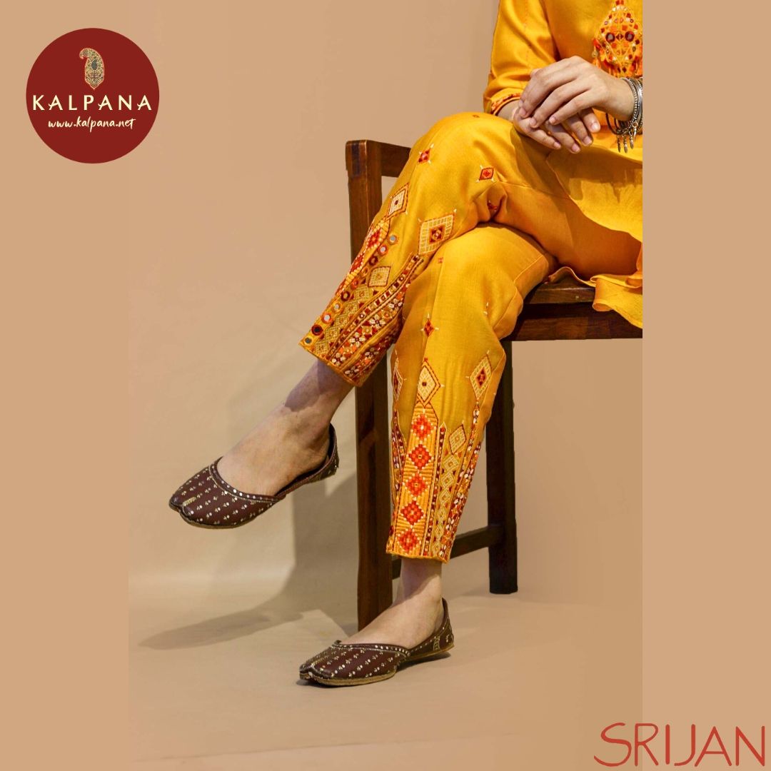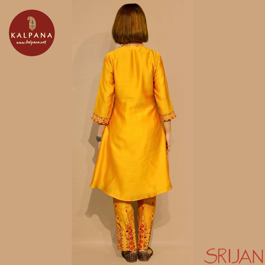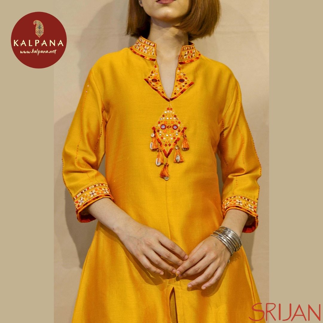 Top : Rabari A Line Yellow Chanderi Shirt and V Neck with embroidery Neckline.