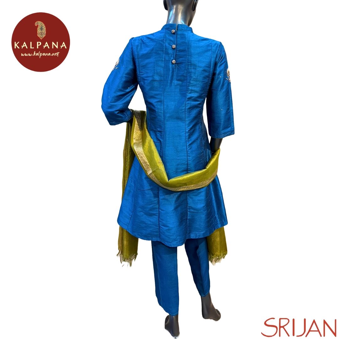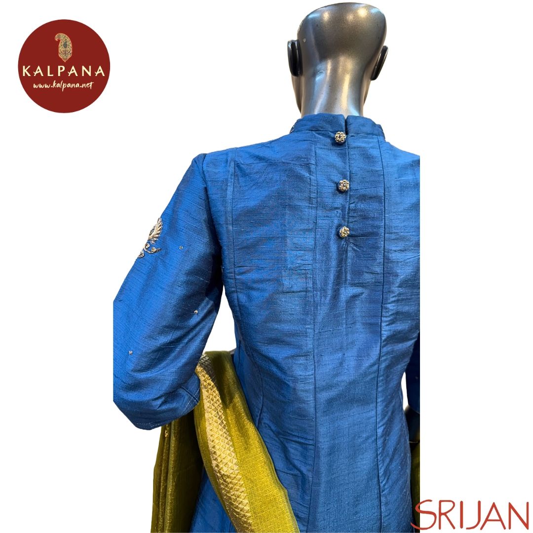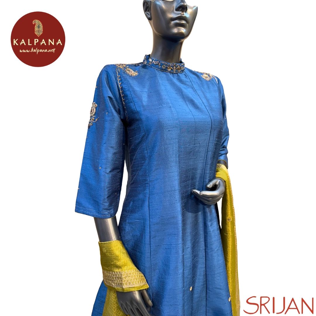 Top : Zardozi Small Kalidaar Blue Silk Shirt and Mandrin Neck Neckline.