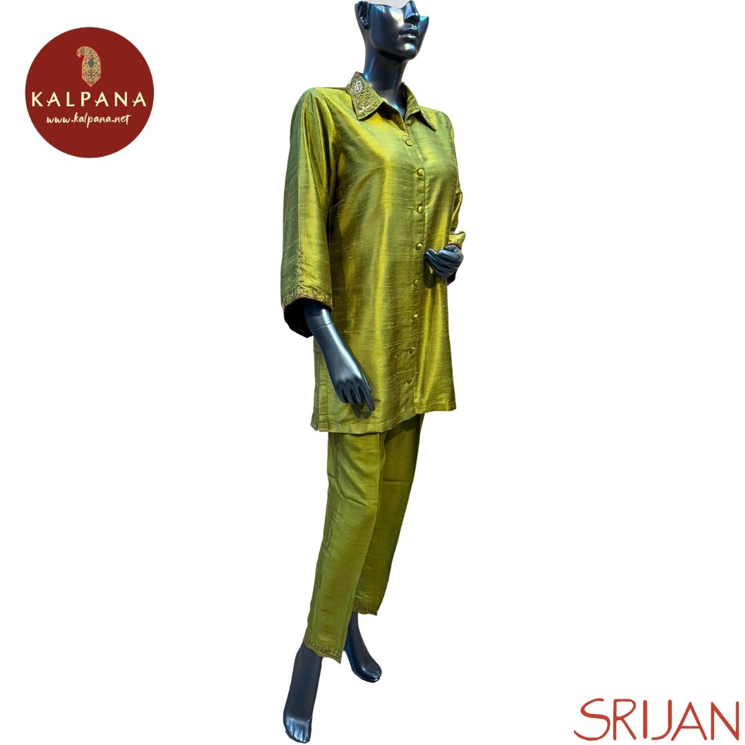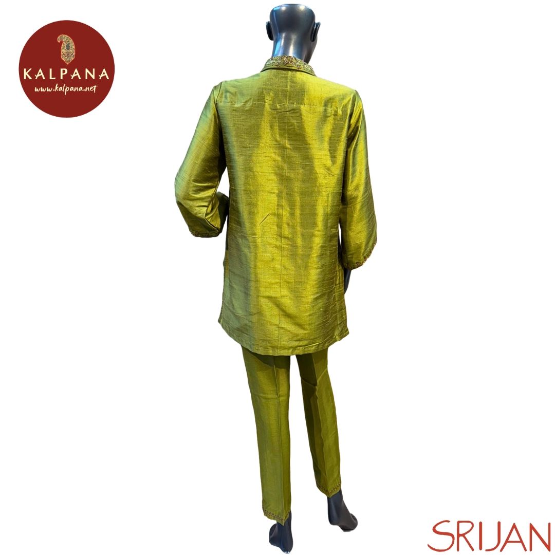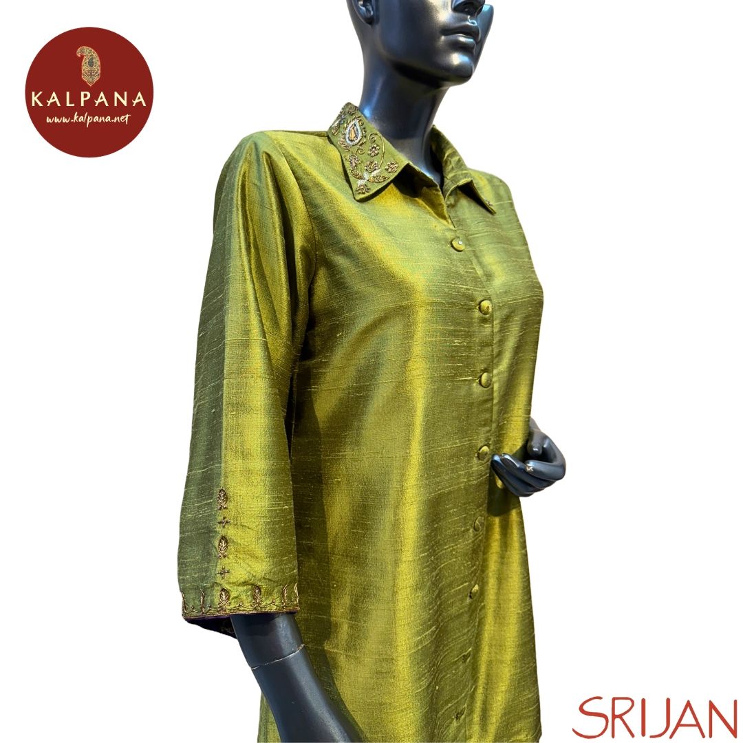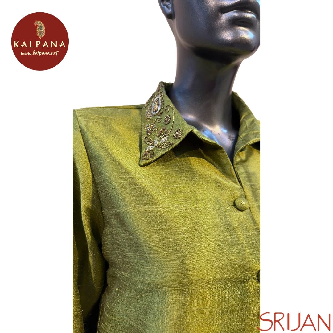 Top : Zardozi A-Line Front Open Green Silk Shirt and Shirt collar Neckline.