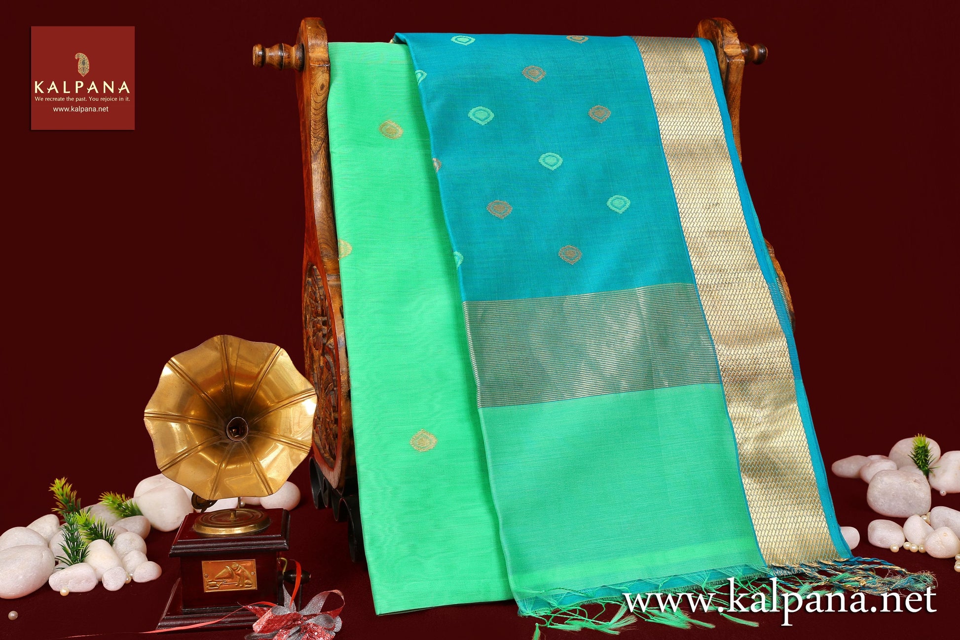 Maheshwari Handloom Pure Cotton Saree with All Over Motifs and Woven Zari Border. The Palla is Woven Zari. It comes with Contrast Colored Plain Unstitched Blouse with Zari Border. Perfect for Multi Occasion Wear. Recommended for Summer season(s).