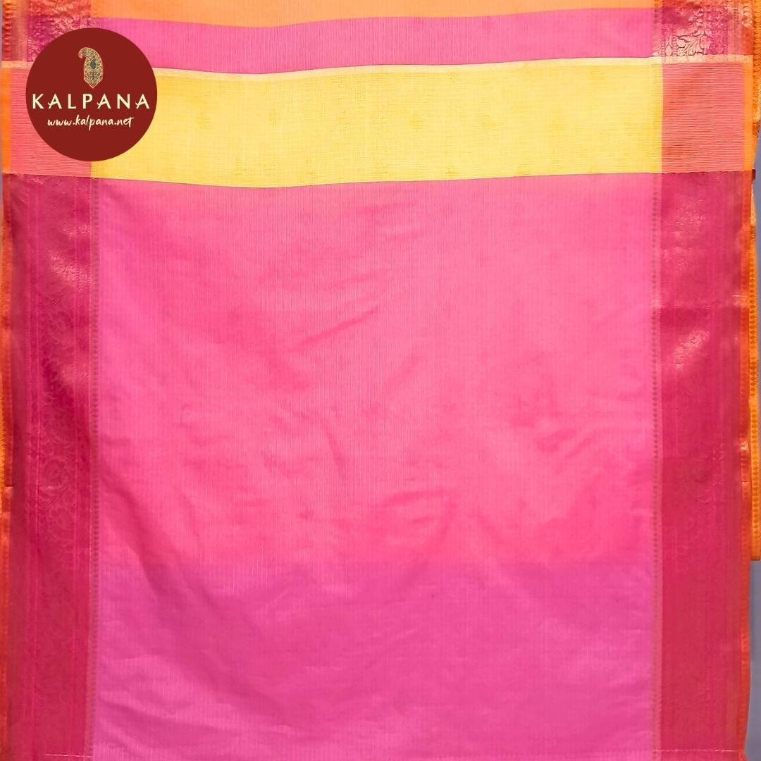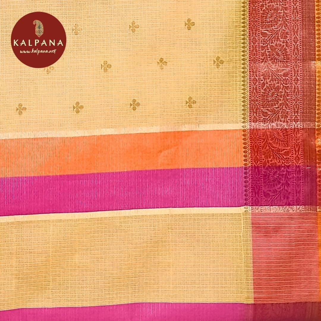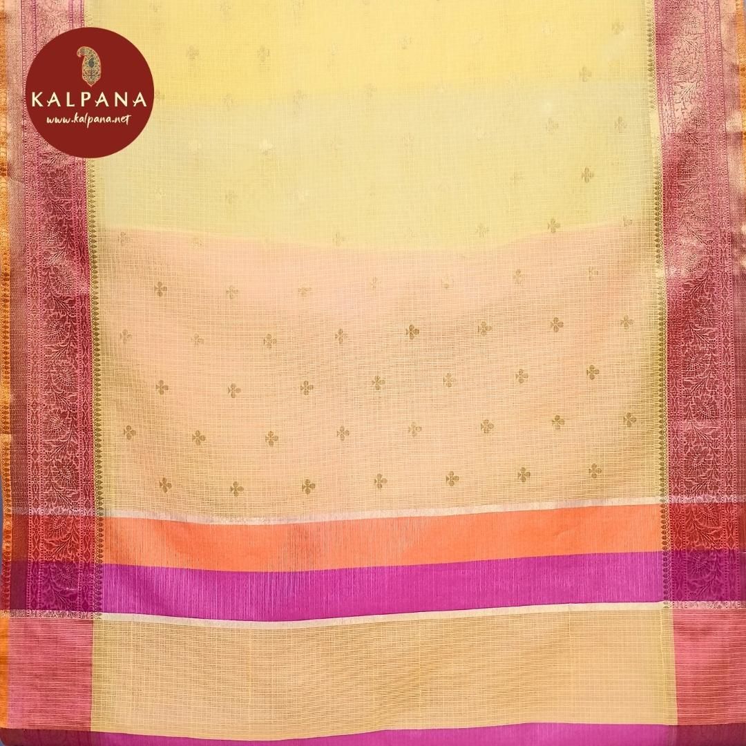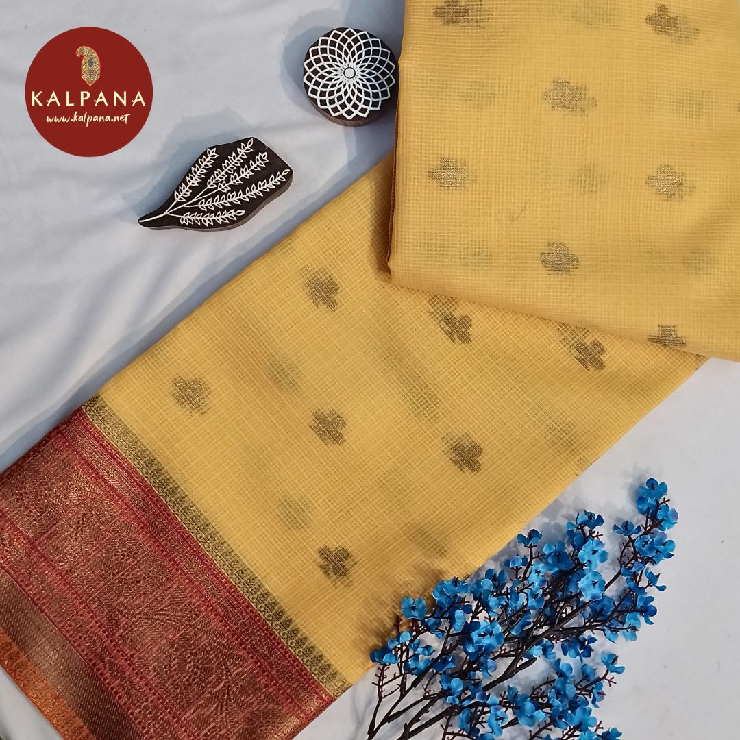 Gold Banarasi Woven Blended Silk Kota Saree with Woven Zari Border. The Palla is Woven Zari. The Contrast colored Plain Unstitched Blouse with woven border has Woven Border Perfect for Semi Formal Wear in Winter season(s). Dry Clean Only.