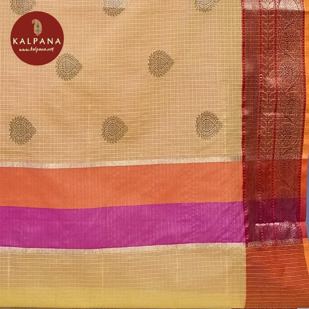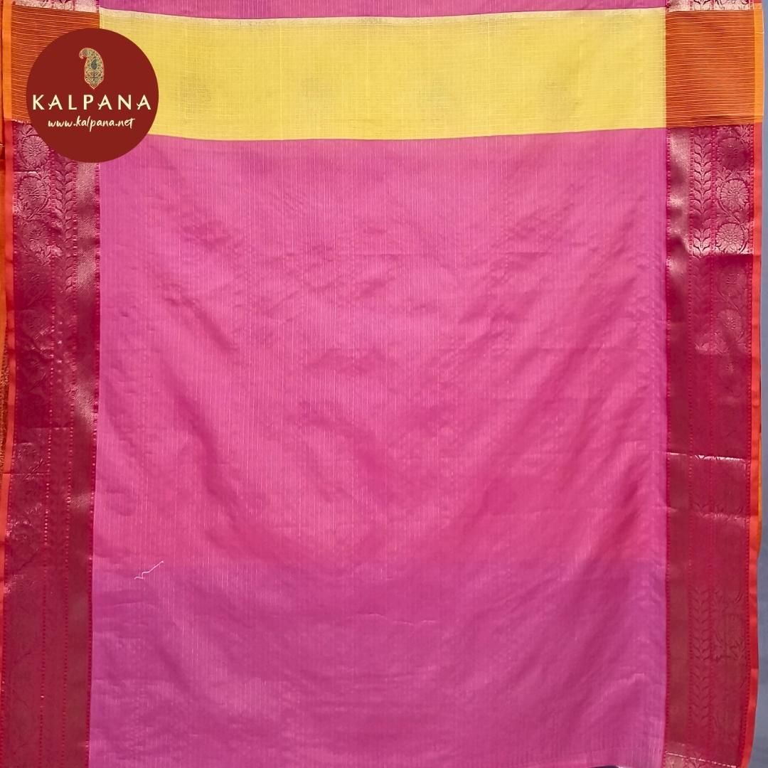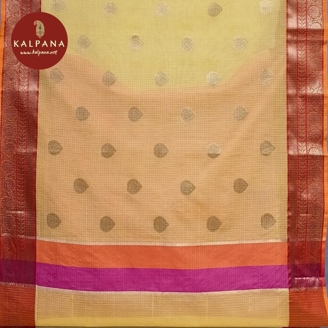 Yellow Benarasi Woven Blended Silk Kota Saree with Woven Zari Border. The Palla is Woven Zari. The Self colored Plain Unstitched Blouse with woven border has Zari Border Perfect for Multi Occasion Wear in Autumn & Winter season(s). Dry Clean Only.