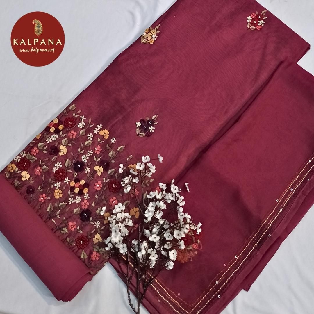 Hand Embroidery Blended SICO Cotton Unstitched Suit with All Over Kantha Work and Embroidered Border. It comes with Self matched Plum color Kantha Work Chanderi Dupatta. The SICO Cotton Salwar is Plum. Perfect for Multi Occasion Wear. Recommended for Festive season(s). Dry Clean Only